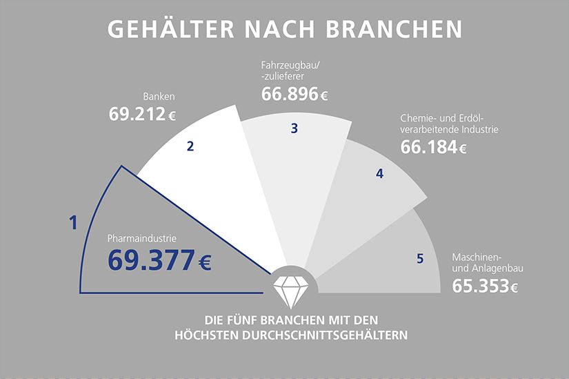Das Spitzentrio der Branchen mit den höchsten Gehältern bilden die Pharmaindustrie (69.380 Euro), Banken (69.210 Euro) sowie die Autoindustrie (66.900 Euro).