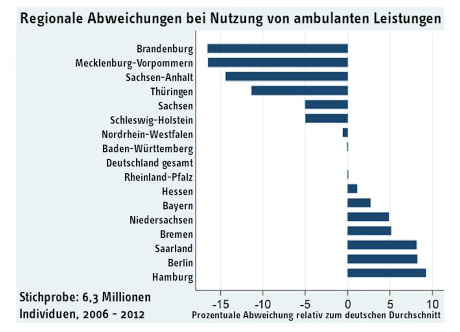 - Wie intensiv ambulante Leistungen genutzt werden, unterscheidet sich stark zwischen einzelnen Regionen in Deutschland. Am stärksten nehmen Menschen in Hamburg, Berlin und dem Saarland ärztliche Leistungen in Anspruch, am wenigsten in Brandenburg, Mecklenburg-Vorpommern und Sachsen-Anhalt.