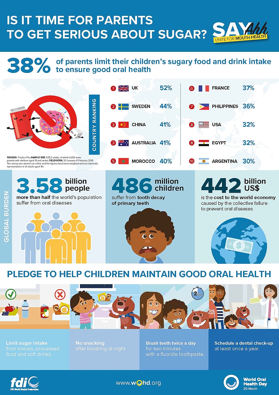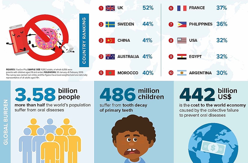 In der Umfrage wurden Eltern mit Kindern unter 18 Jahren gefragt: Welche Maßnahmen haben Sie bisher getroffen, um für eine gute Mundgesundheit Ihres Kindes/Ihrer Kinder zu sorgen?" Die Ergebnisse zeigen, dass weniger als ein Drittel der Eltern in den USA den Zuckerkonsum ihrer Kinder einschränken, während die Eltern in Großbritannien am aktivsten sind. Dort gab die Hälfte der Eltern an, die Zuckermenge einzuschränken. Auch wenn es darum ging, ihre Kinder mindestens einmal im Jahr zu einer zahnärztlichen Untersuchung mitzunehmen, lagen Eltern in Großbritannien vorn, während weniger als die Hälfte der Eltern in den anderen neun Ländern einen jährlichen Besuch beim Zahnarzt sicherstellt.